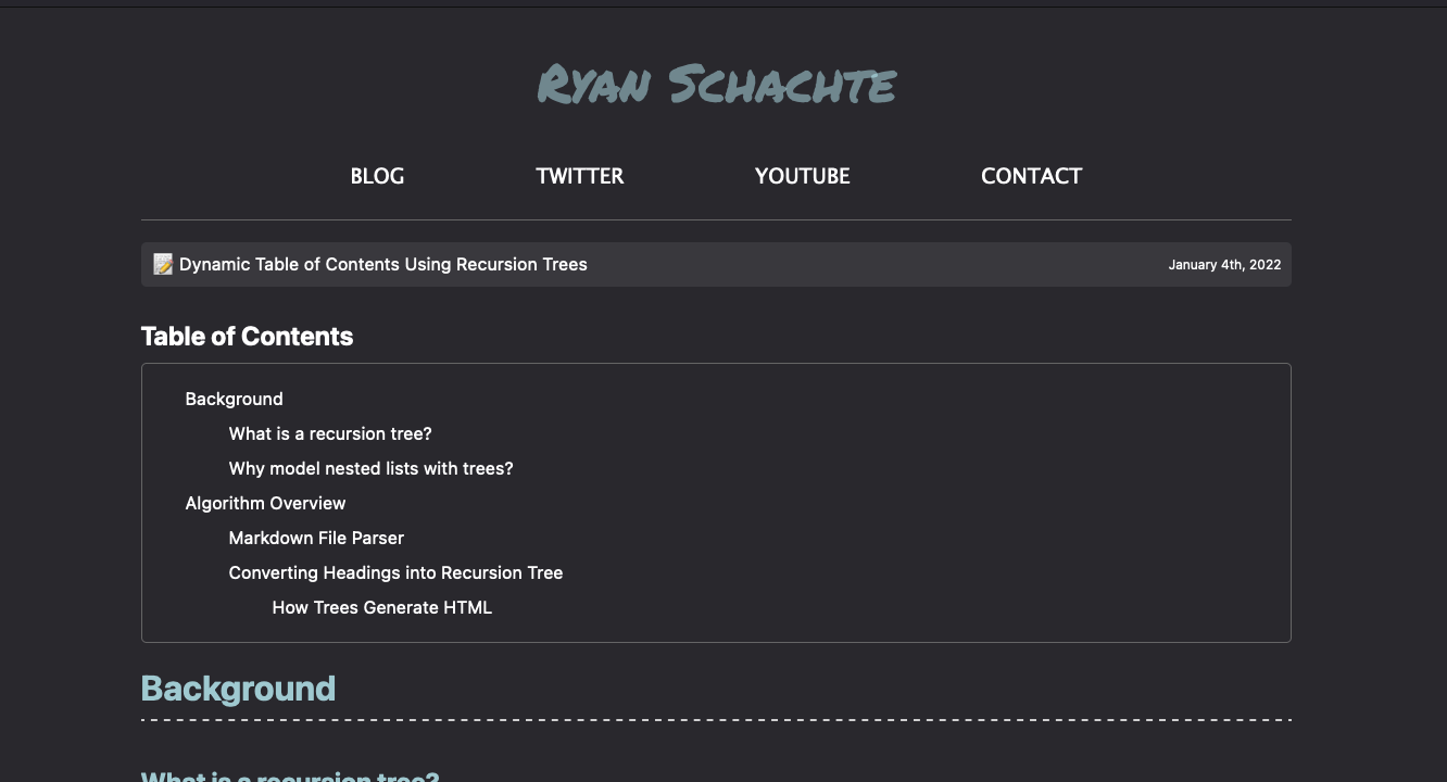 Table of contents are nice to have on a site full of complex information. However, writing an entire post then later formatting the HTML is time consuming. In this post, I walk through an algorithm I designed to parse your blog posts dynamically and generate a table of contents for you at runtime or buildtime.